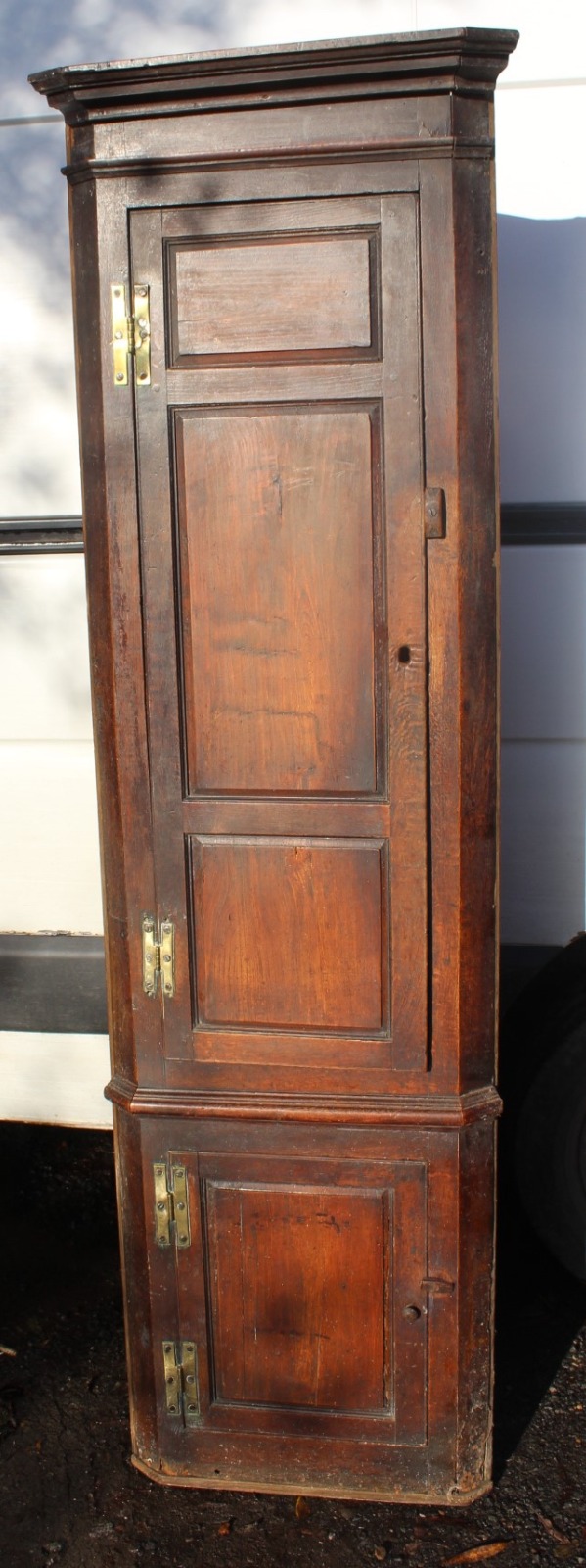 Tall 4 Panelled Oak Corner Cupboard on Stand with Shelves c.1780