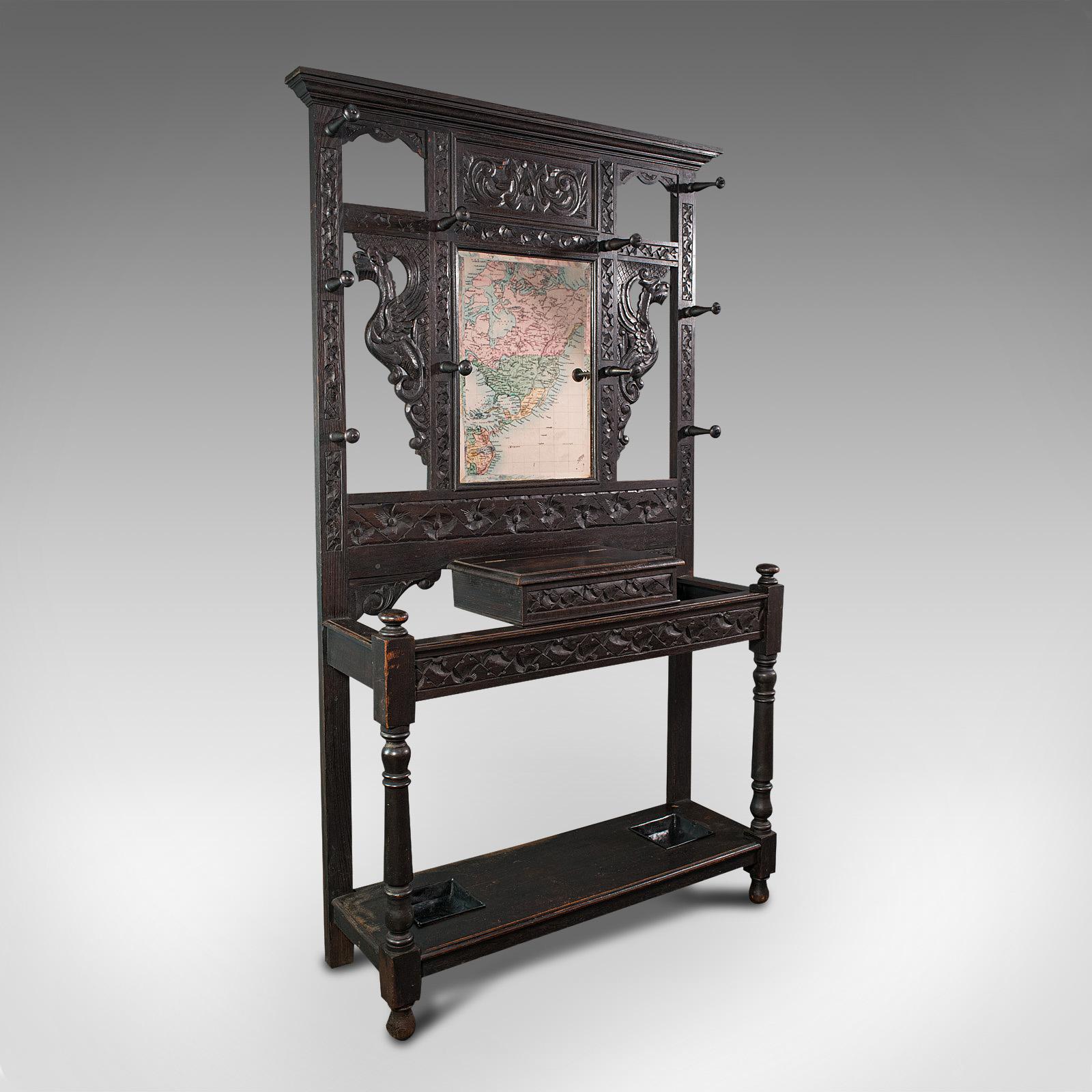 Tall Antique Hall Stand, English, Oak, Mirror, Coat Rack, Chinoiserie, Victorian