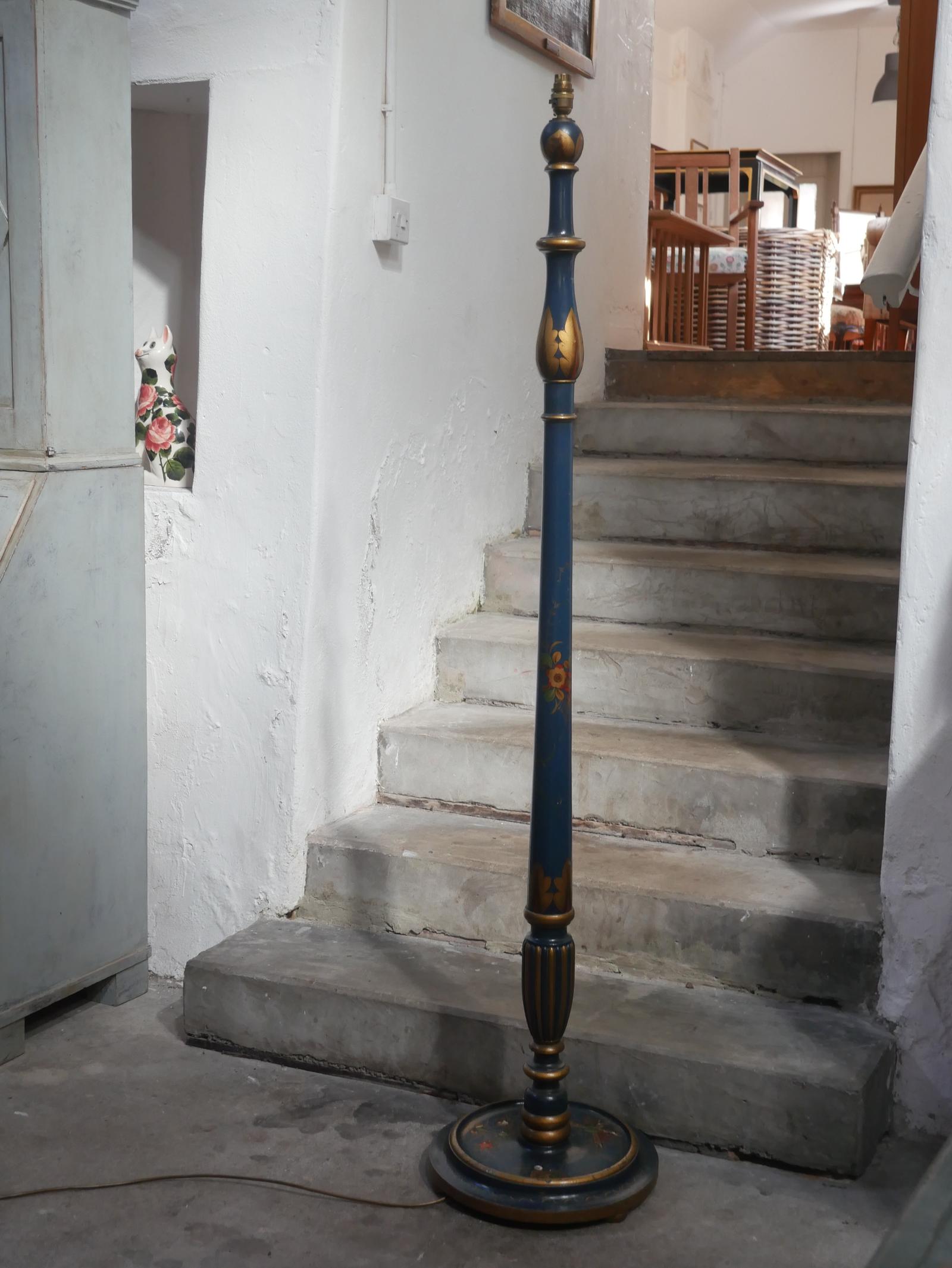 This tall blue Chinoiserie floor lamp dates to the 1920s. It features a lacquer base with intricate painted designs characteristic of the Chinoiserie style. The lamp is in good condition, lovely blue with gilt decoration, pat tested, the overall height and design make it suitable for various interior settings.