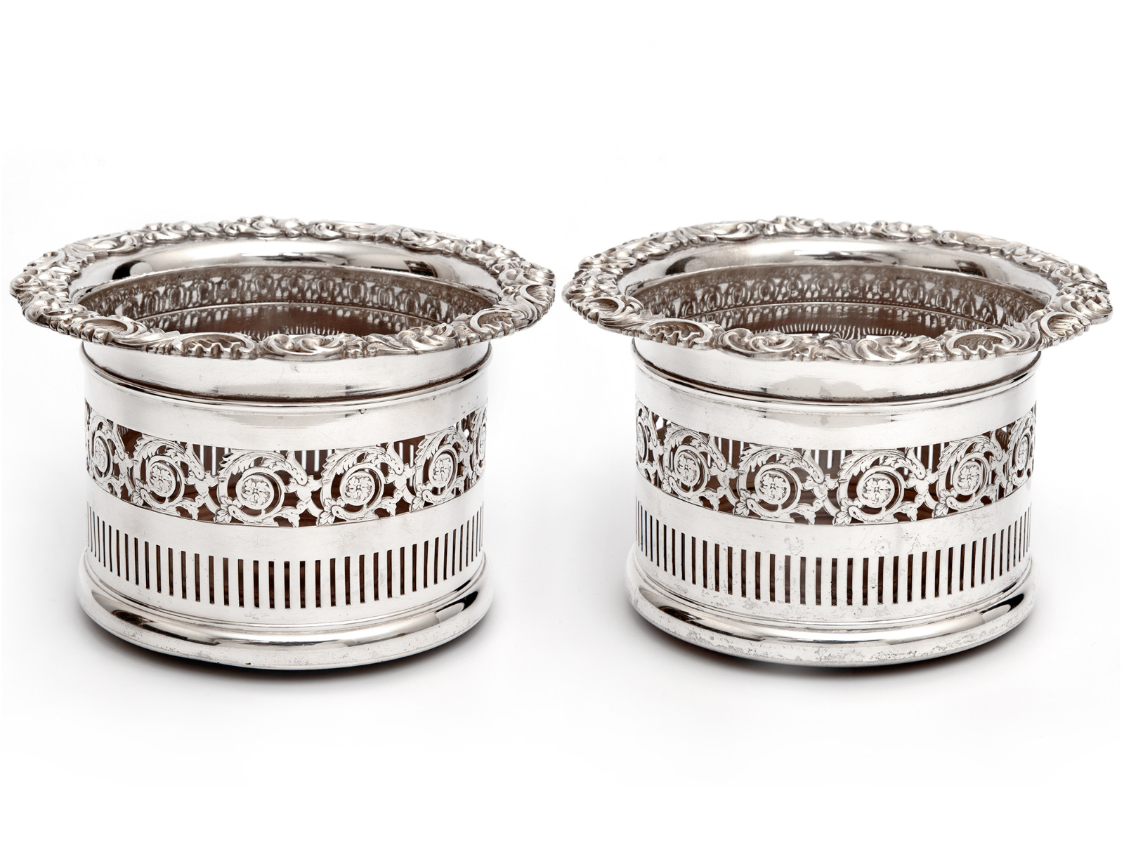 Tall Edwardian Silver Plated Coasters with Floral and Scroll Applied Mounts