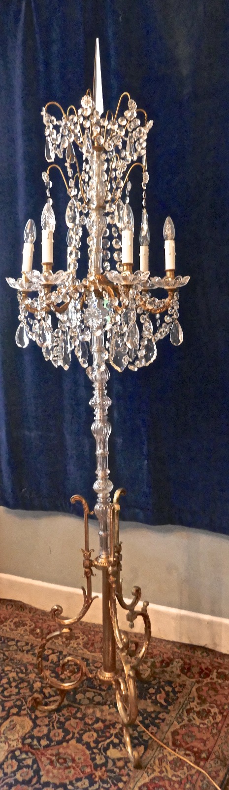 Tall French Brass & Crystal Floor Standing 6 Branch Chandelier Lamp