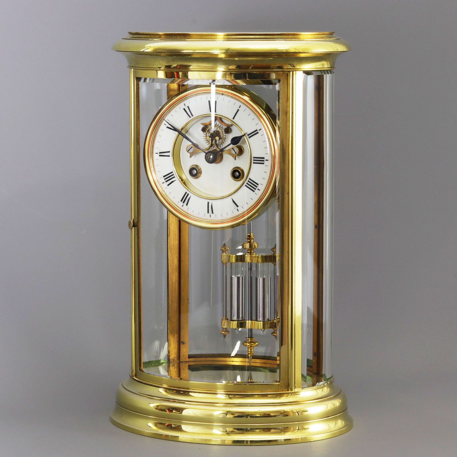 Tall Oval Four Glass Brass Mantle Clock with Exposed Escapement C.1885