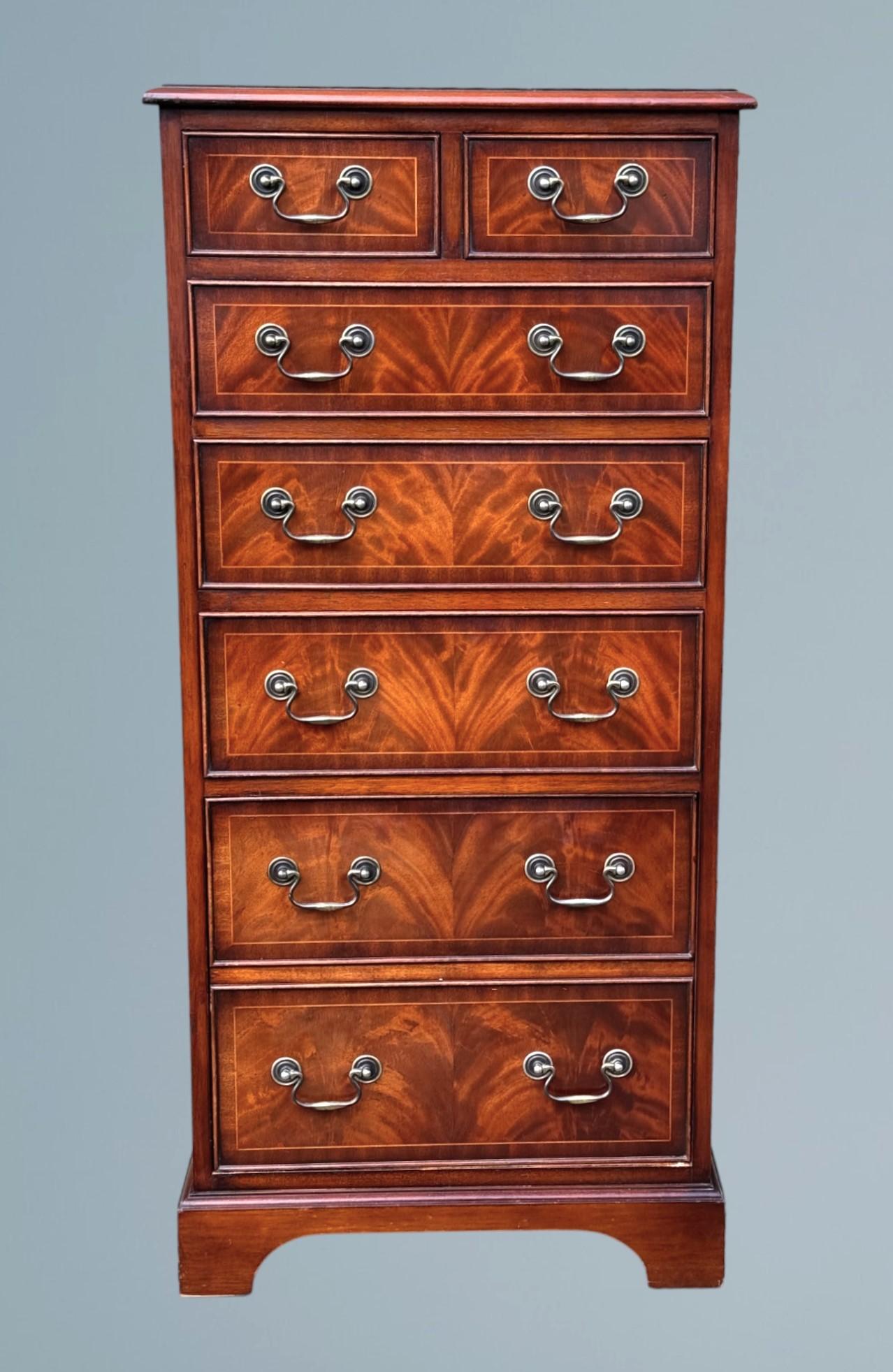 Tall Slim Inlaid Mahogany Chest of Drawers, Labelled Bradley Furniture