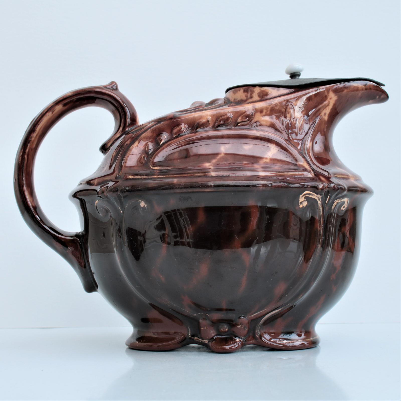 A scarce teapot in a wonderful two-tone brown treacle glaze with gilt accents, and a pewter lid with incorporated strainer, underneath impressed 'Patent applied for No 17210'.