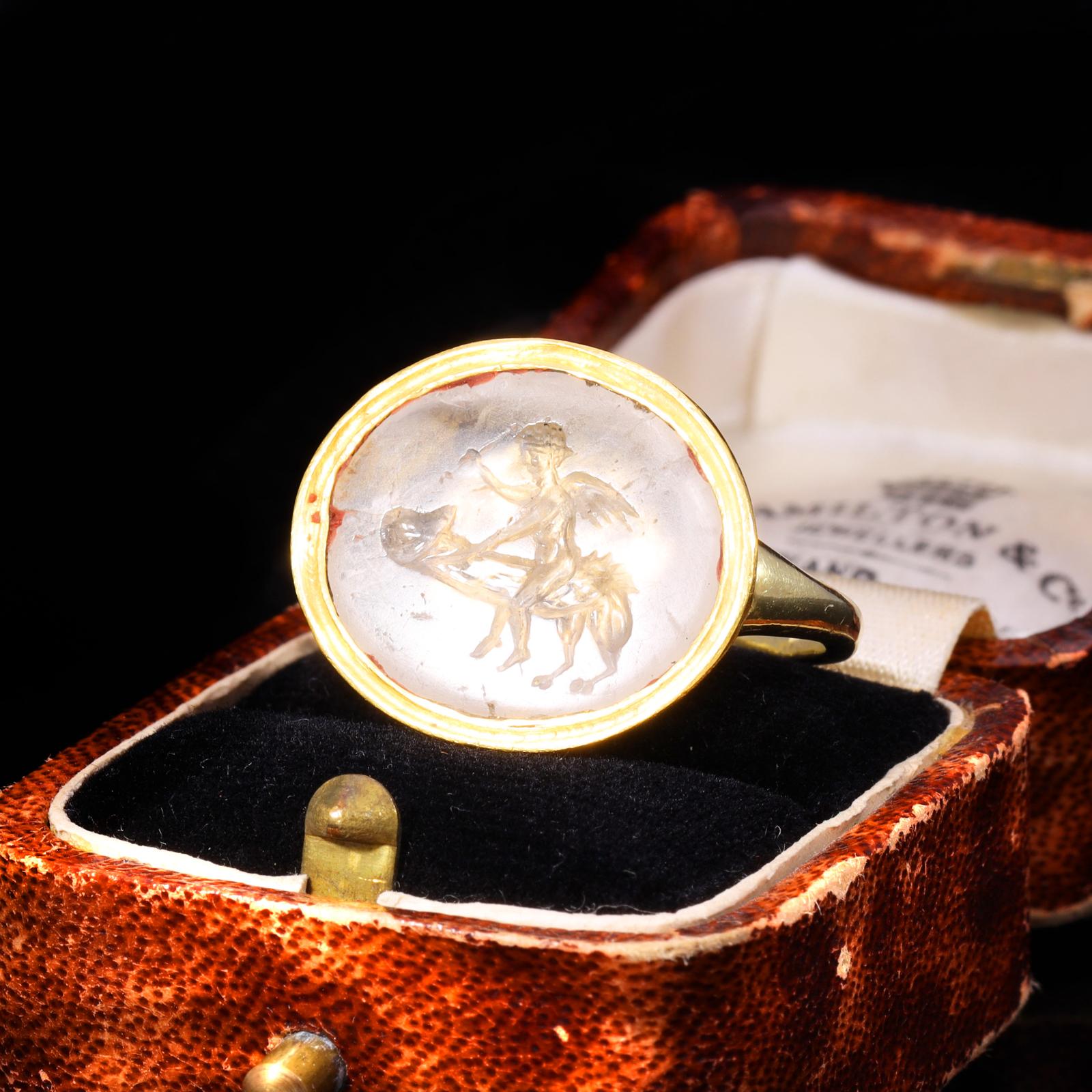 This incredible ring holds an ancient Roman intaglio dating back to the 2nd Century. Inset carved into the stone is a winged putto, likely Cupid, sat atop a phallus with fawn legs and hooved feet.