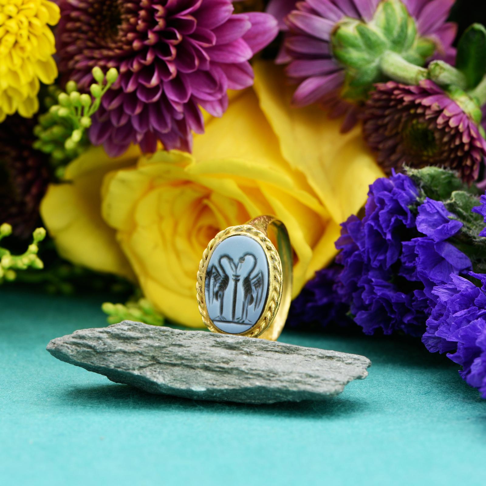 The Ancient Roman Gold Ring with Two Birds at an Altar
