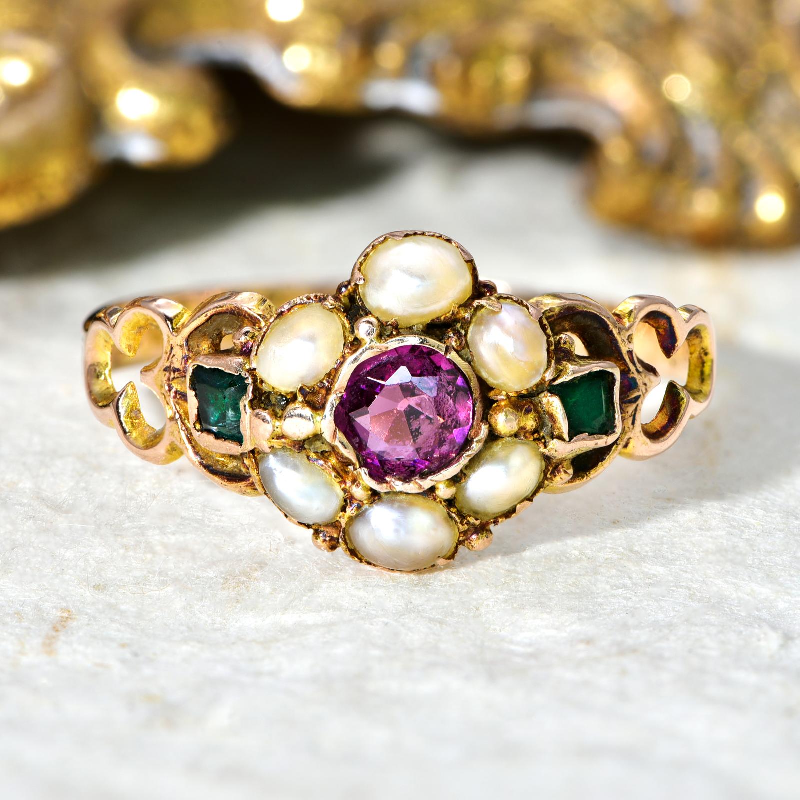 The Antique 1864 Victorian Garnet & Pearl Flower Ring