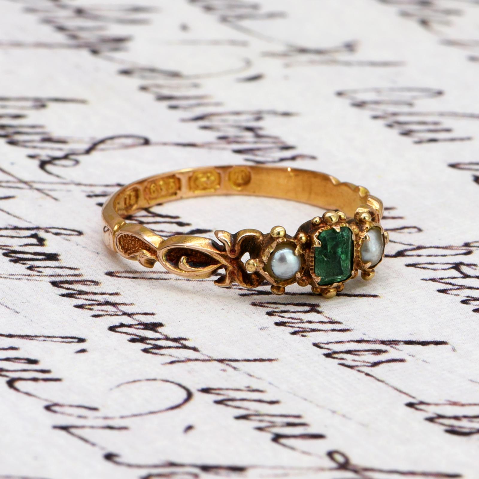 The Antique 1868 Victorian 15ct Gold Emerald and Pearl Ring