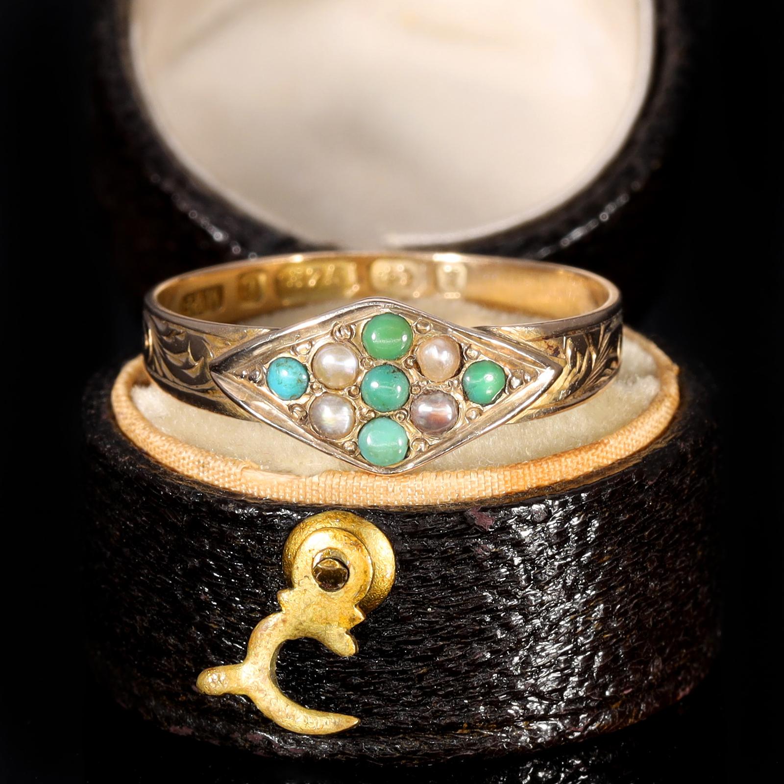 The Antique 1873 Victorian Turquoise and Pearl Engraved Ring