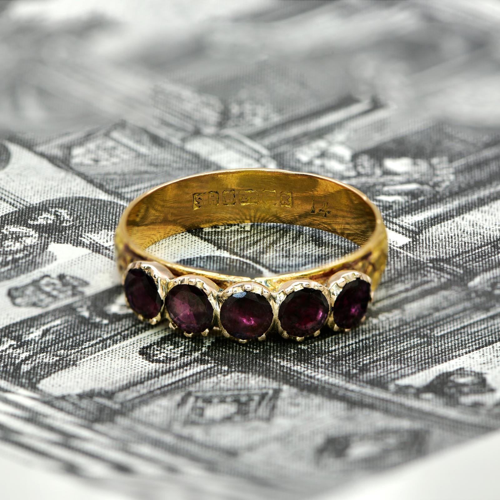 The Antique 1909 Edwardian Five Garnet Floral Banded Ring