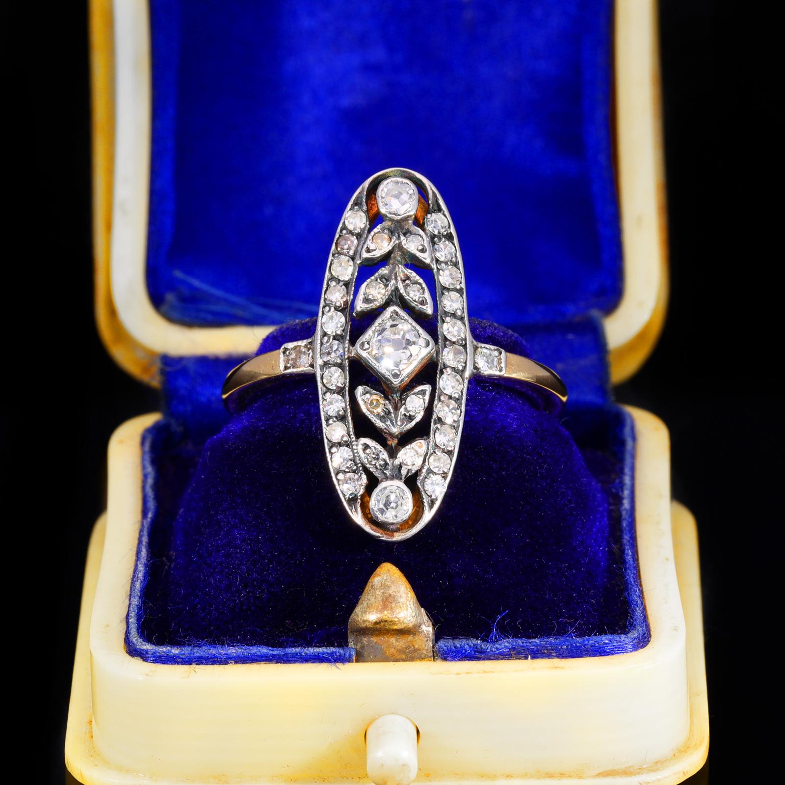 This delicately crafted ring takes a rounded navette form with openwork silver settings, holding 35 sparkling diamonds in a foliate and floral design. The design lends this ring an elegant yet showstopping look, while its shape elongates and flatters the finger when worn. The silver head of the ring is contrasted with a plain yellow gold band.