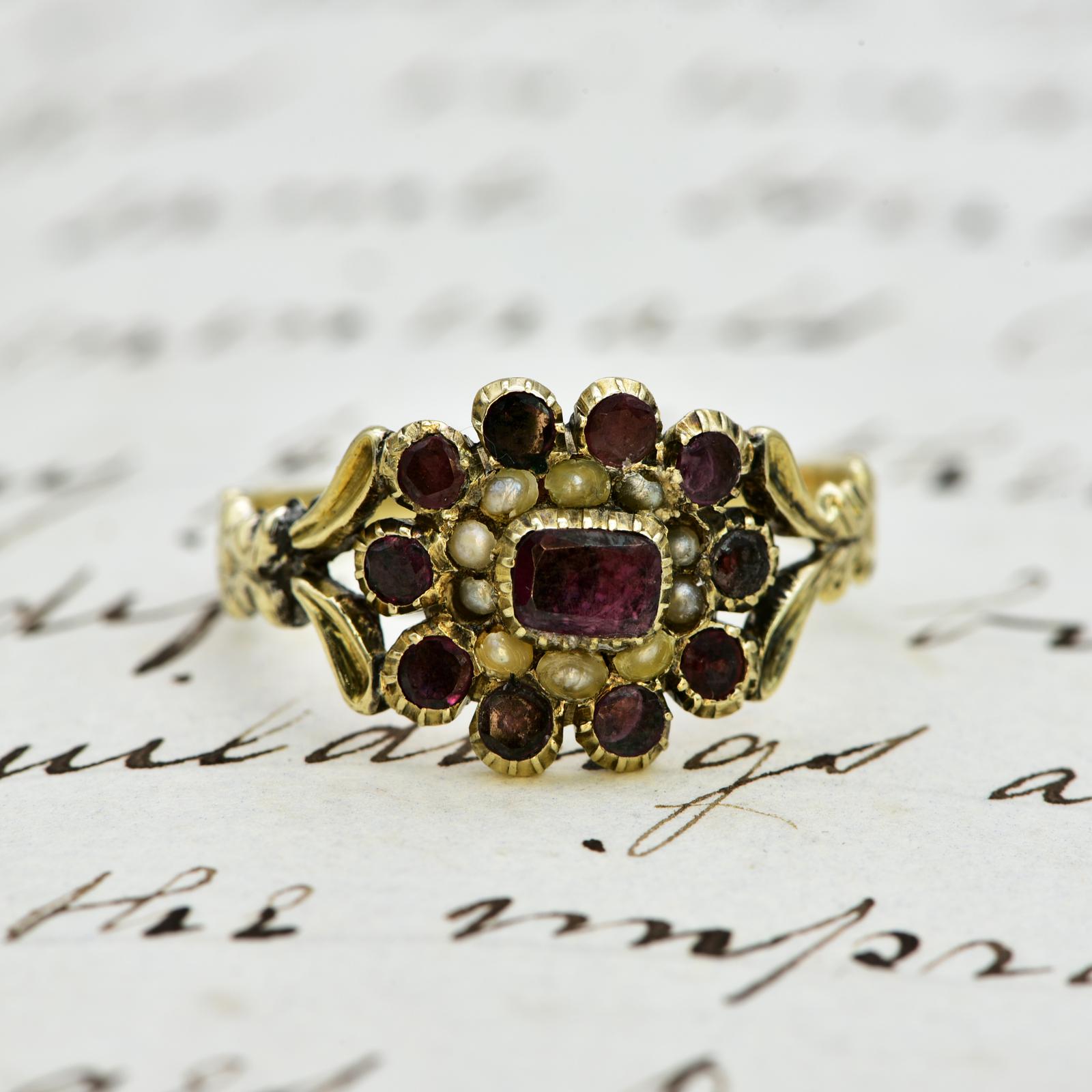 The Antique Georgian Garnet & Pearl Ornate Floral Ring