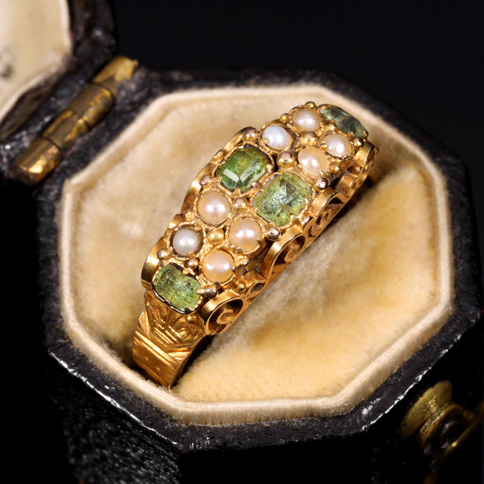 The Antique Victorian 1870 Green Beryl & Pearl Ornate Ring