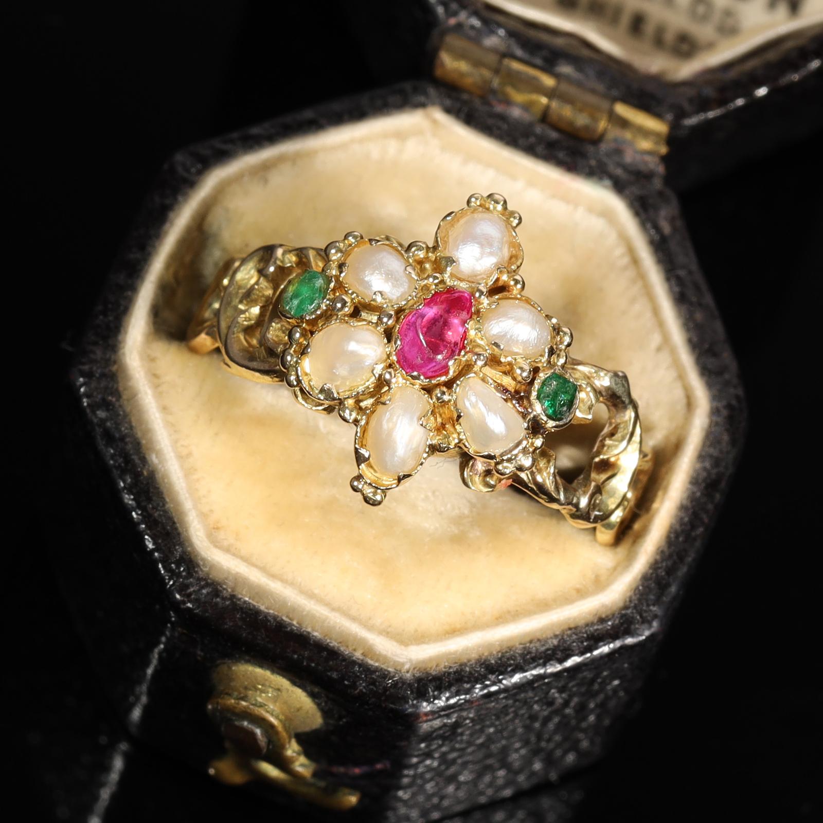 The Antique Victorian Ruby, Pearl & Emerald Daisy Ring