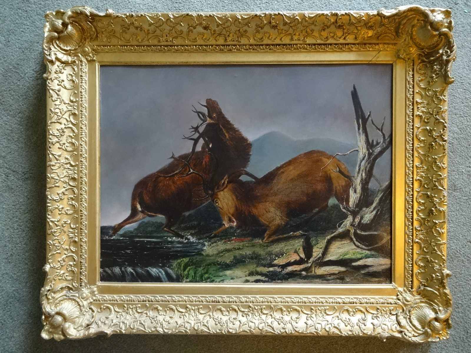 The Scottish Fighting Stags - Stunning 19th Century Highland Dear Landscape Painting