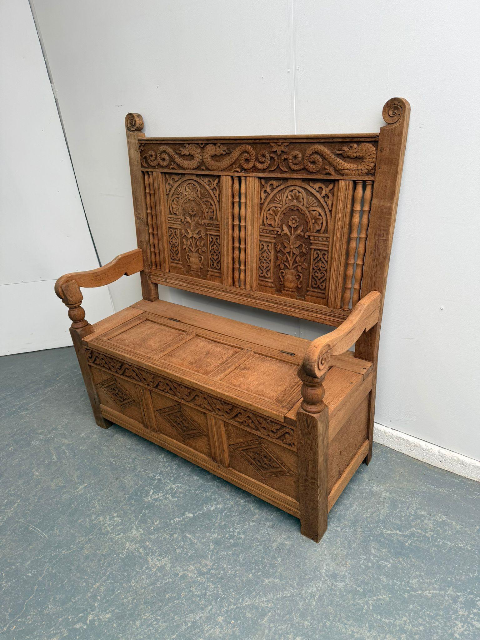 The Very Best Stripped Golden Oak 1920s Carved 2 Seater Hall Box Settle
