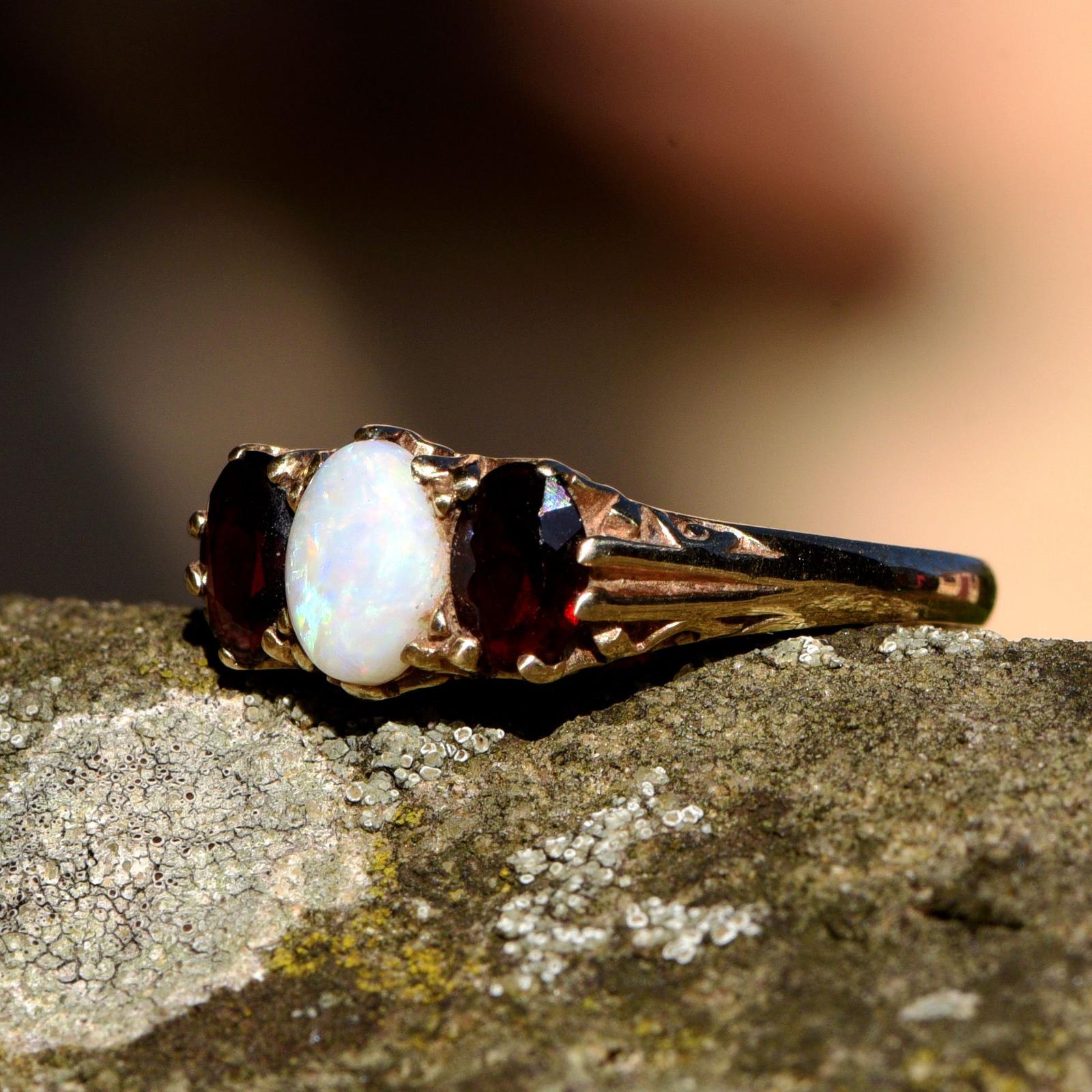 The Vintage Opal And Garnet Openwork Scroll Gold Ring