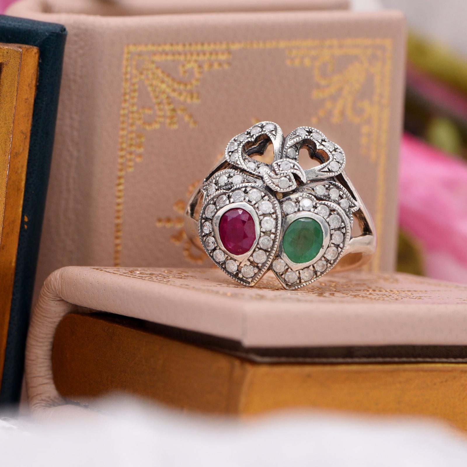 The Vintage Victorian Style Ruby and Emerald Heart and Bow Diamond Ring