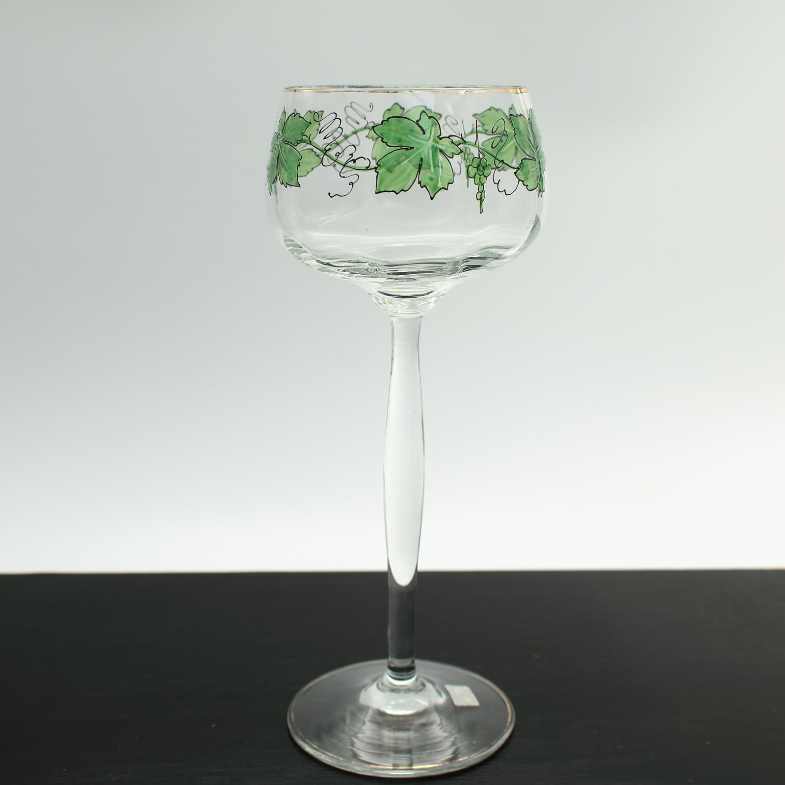 Wonderful quality German hock wine glass from the Art Nouveau period, made by Bavarian glassmaker Theresienthal, with tall stem and hand enamelled fruiting vines decorations to bowl.