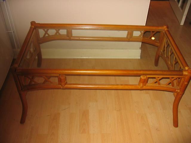 Thick Bamboo Glass Topped Table and Two Matching Nesting Stools / Stands