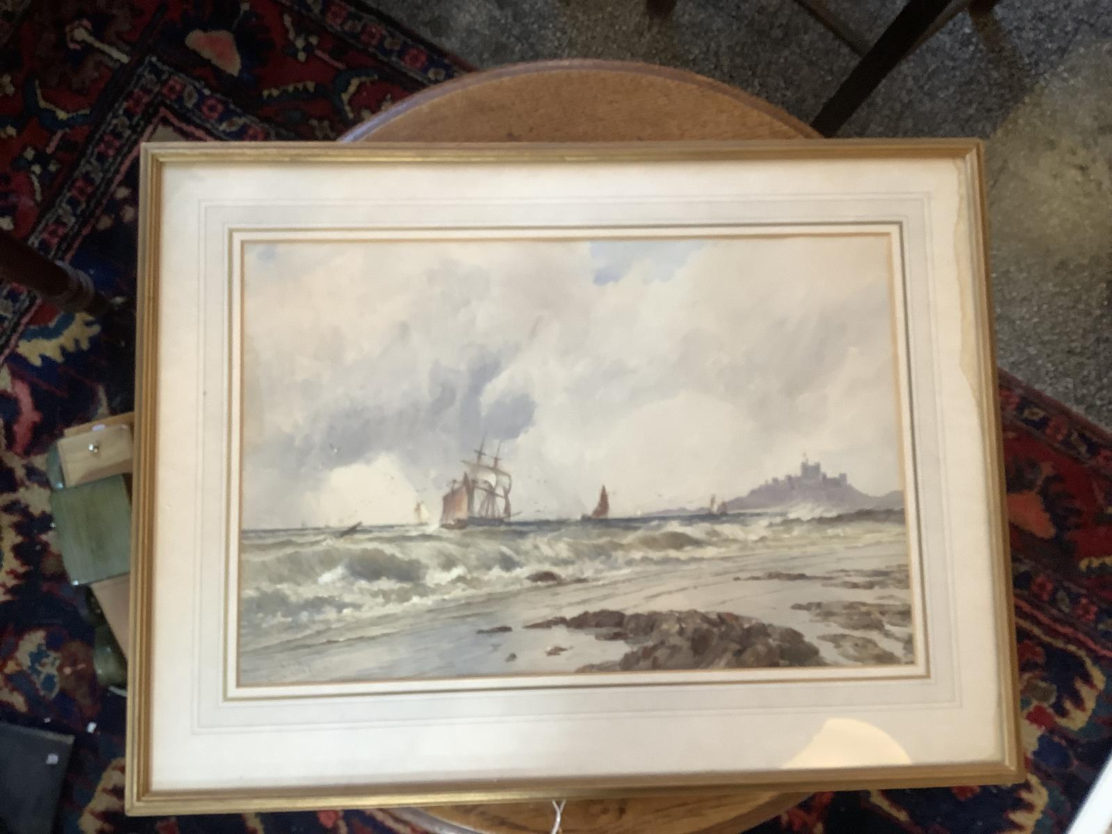 A lovely view of the Bamburgh coast, with its wild empty beach and castle, with shipping in choppy seas. Signed lower left. Sold at Christies 1972.