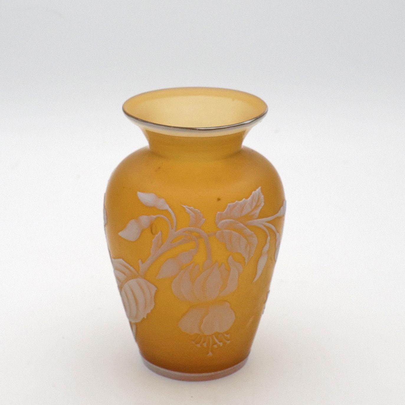 Beautiful vase in amber colour with white over yellow cut glass vase of baluster form. Decorated with a white floral pattern including fuchsia flowers. This fine vase was made with Uranium and has a fluorescence. 12cm high.