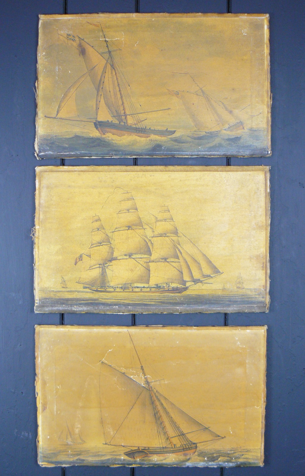 Three Attractive Early Victorian Hand Tinted Print Ship Scenes Laid on Canvas (1 of 1)