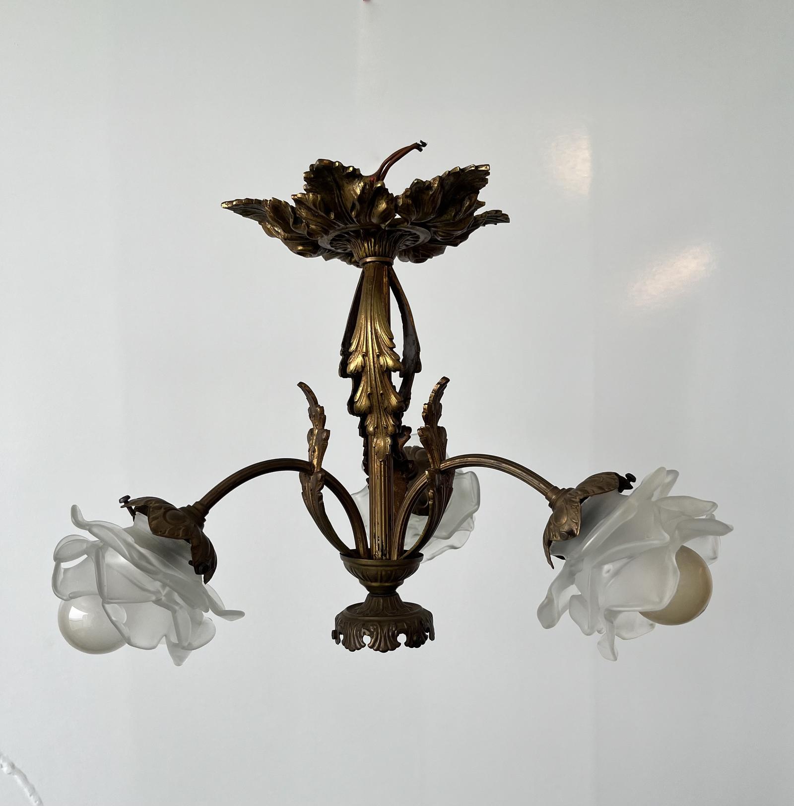 Three Light French Brass Pendant Chandelier with Vaseline Shades