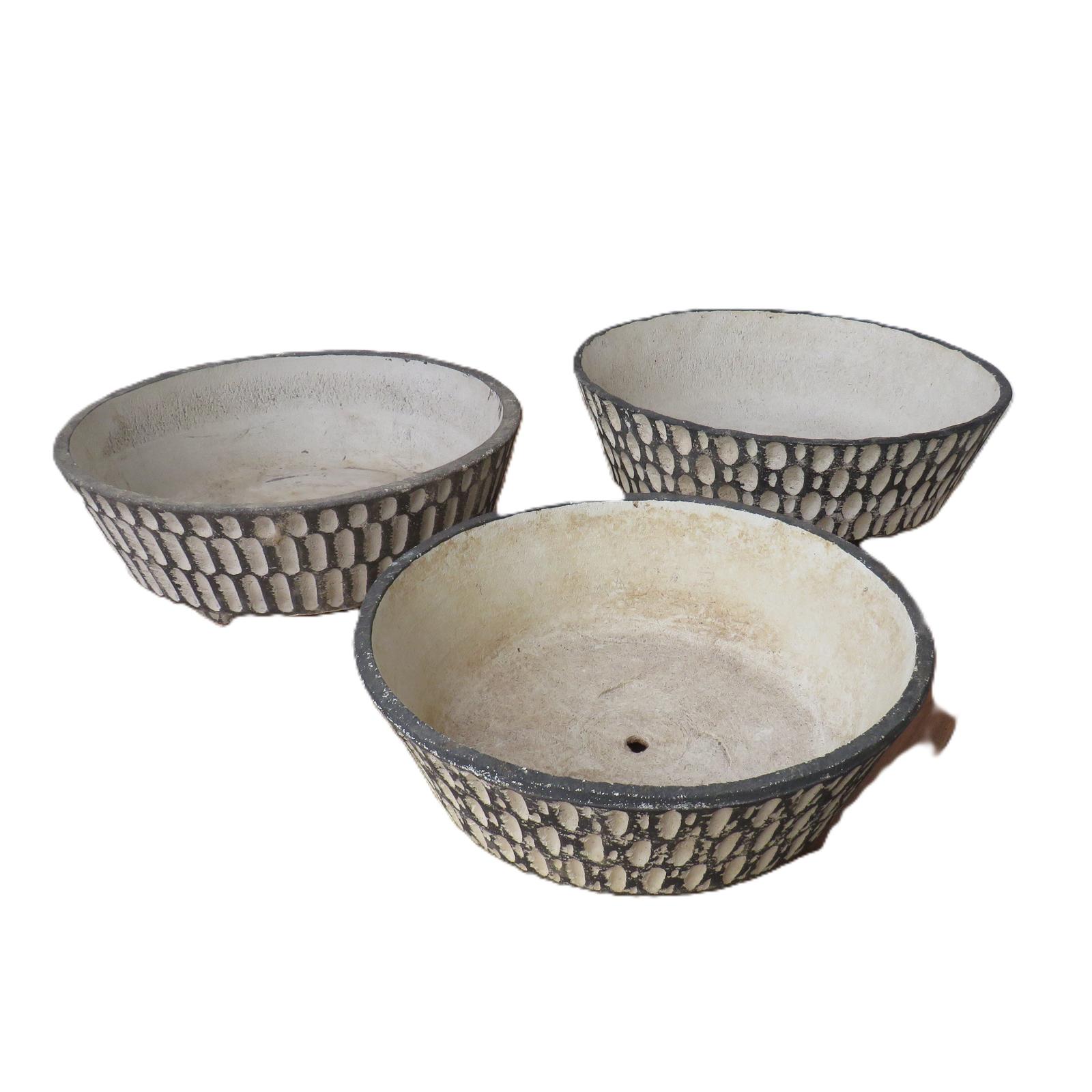 Set of three shapely mid 20th century Swiss decorative concrete garden planters, pots with drainage holes.
