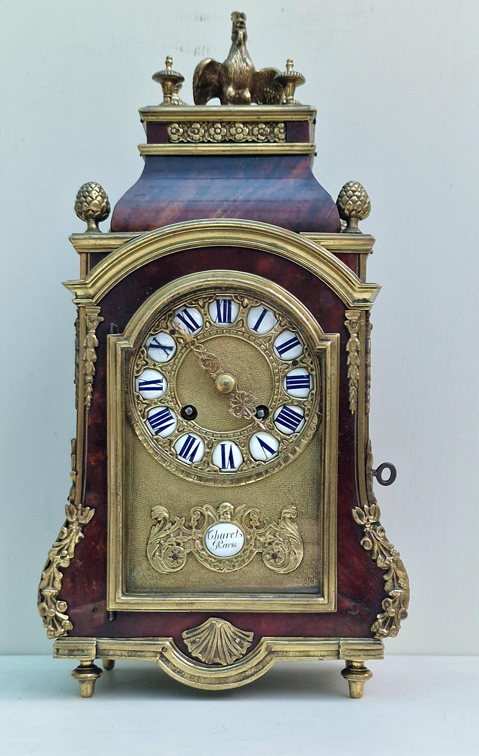 A good quality and impressive French tortoishell mantel clock. Dark red ground to the case with side glass apertures. A glass front door panel to the gilded dial. Individual enamel numerals and a name plaque to the base signed 'Thuret'. Pineapple finials to the stepped pediment and surmounted by a Cockrell.