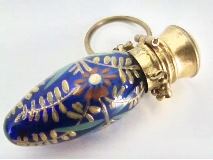 Tiny Hand Painted Scent / Smelling Salts Bottle With Brass Lid And Glass Stopper