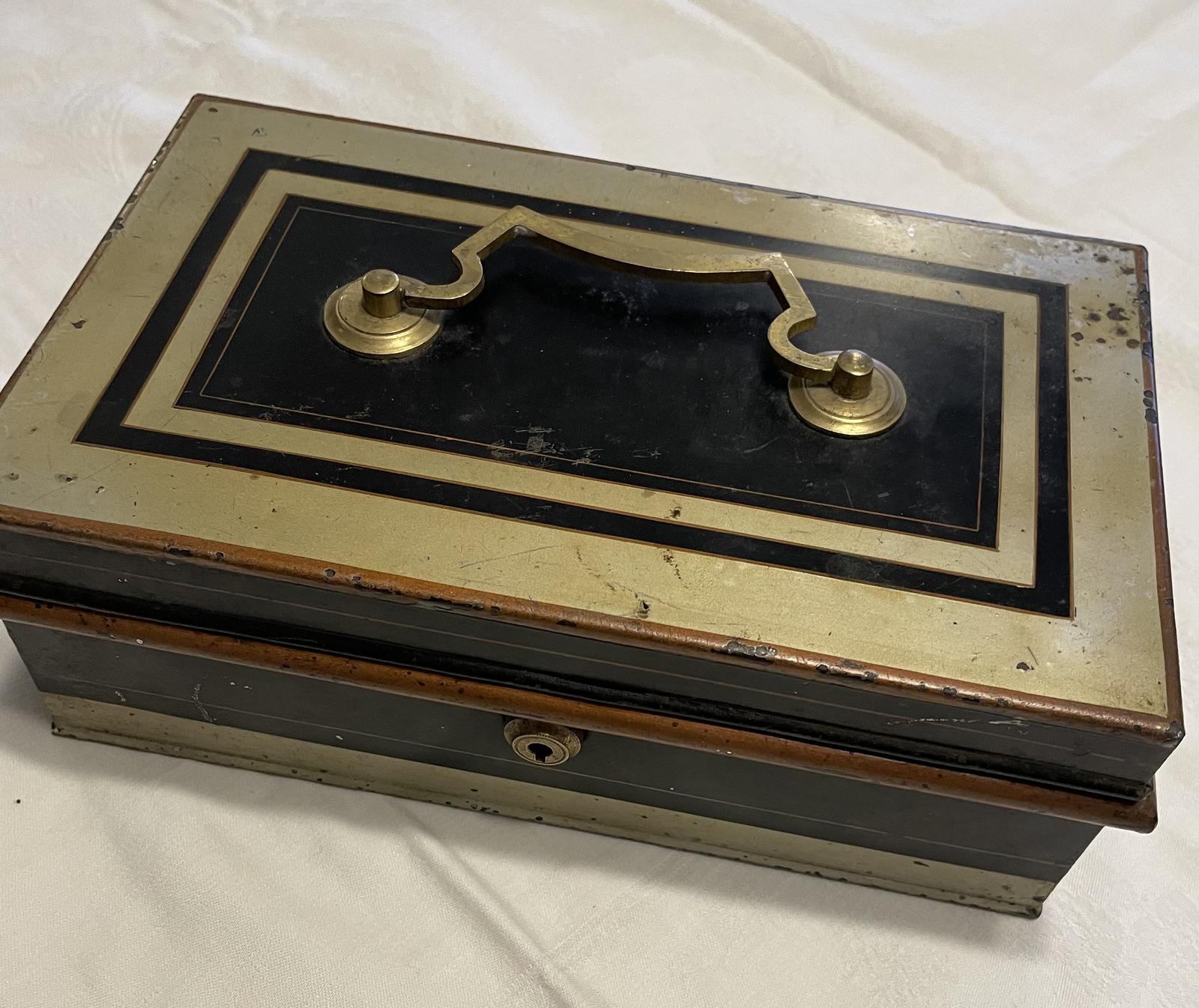 A medium size Toleware cash box with internal tray. Brass carrying handle. Working Bramah lock with key.