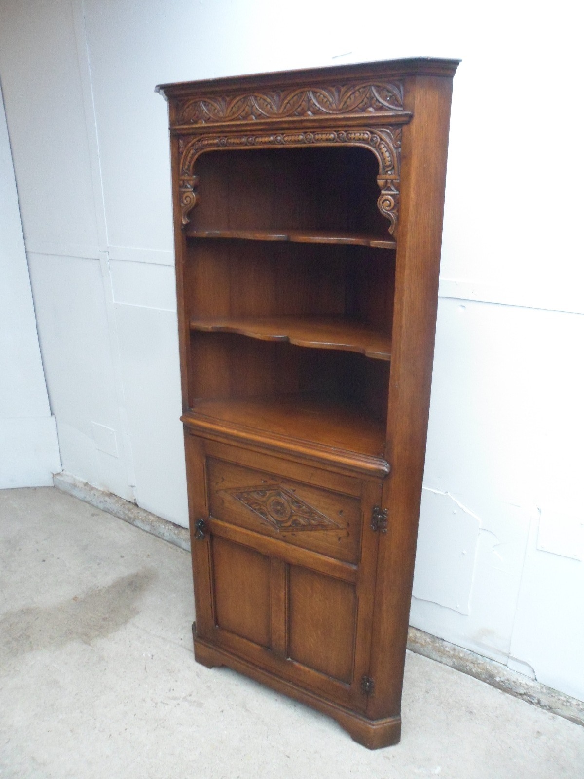 Top Quality 1920s Golden Oak 1 Piece Carved Corner Cabinet