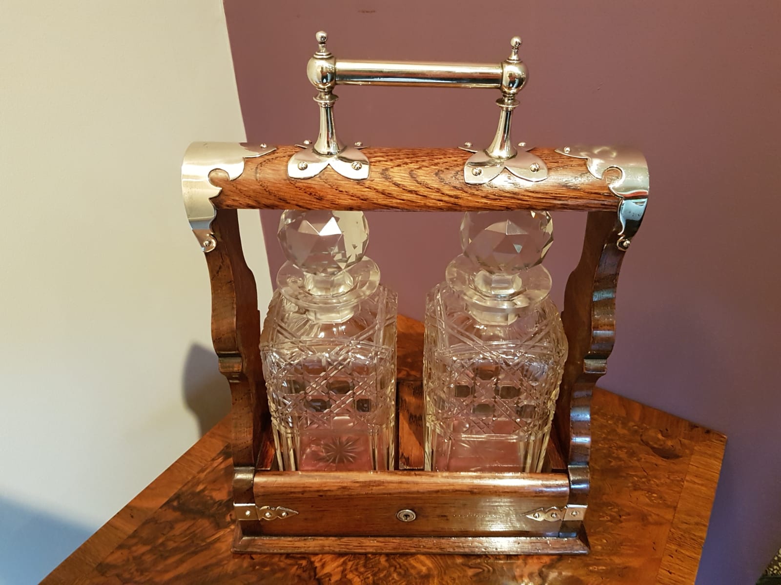 Top Quality Antique Two Bottle Oak & Silvered Tantalus c.1880