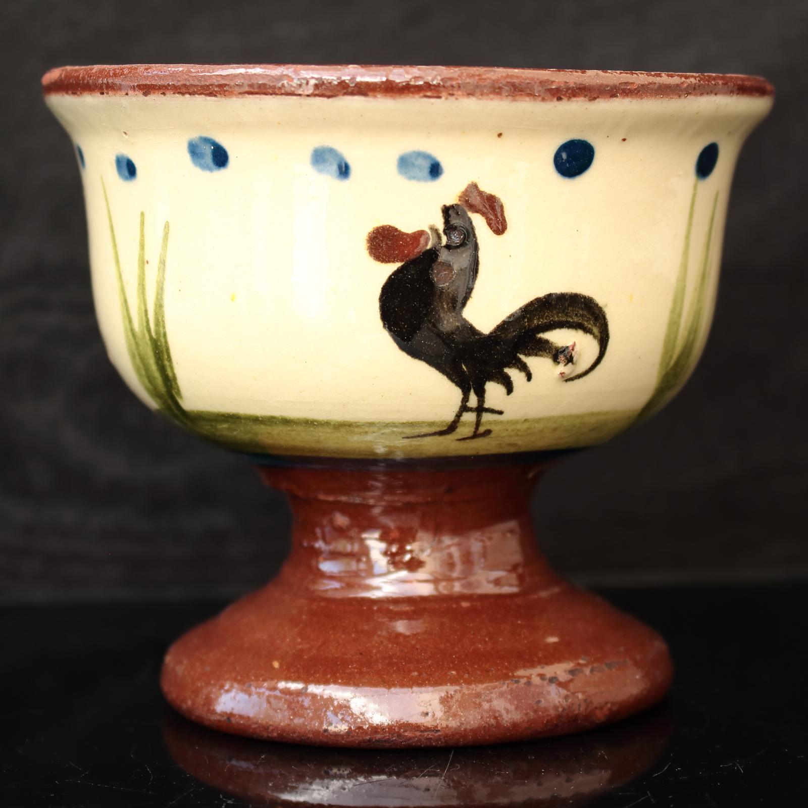 A charming glazed stoneware sugar bowl typical of Torquay pottery featuring a hand painted rooster and a motto 'Sweeten for yourself' on a cream background with blue dots red terracotta foot and rim border. Made during the first half of the 20th century in Devon, England, no discernible makers mark.