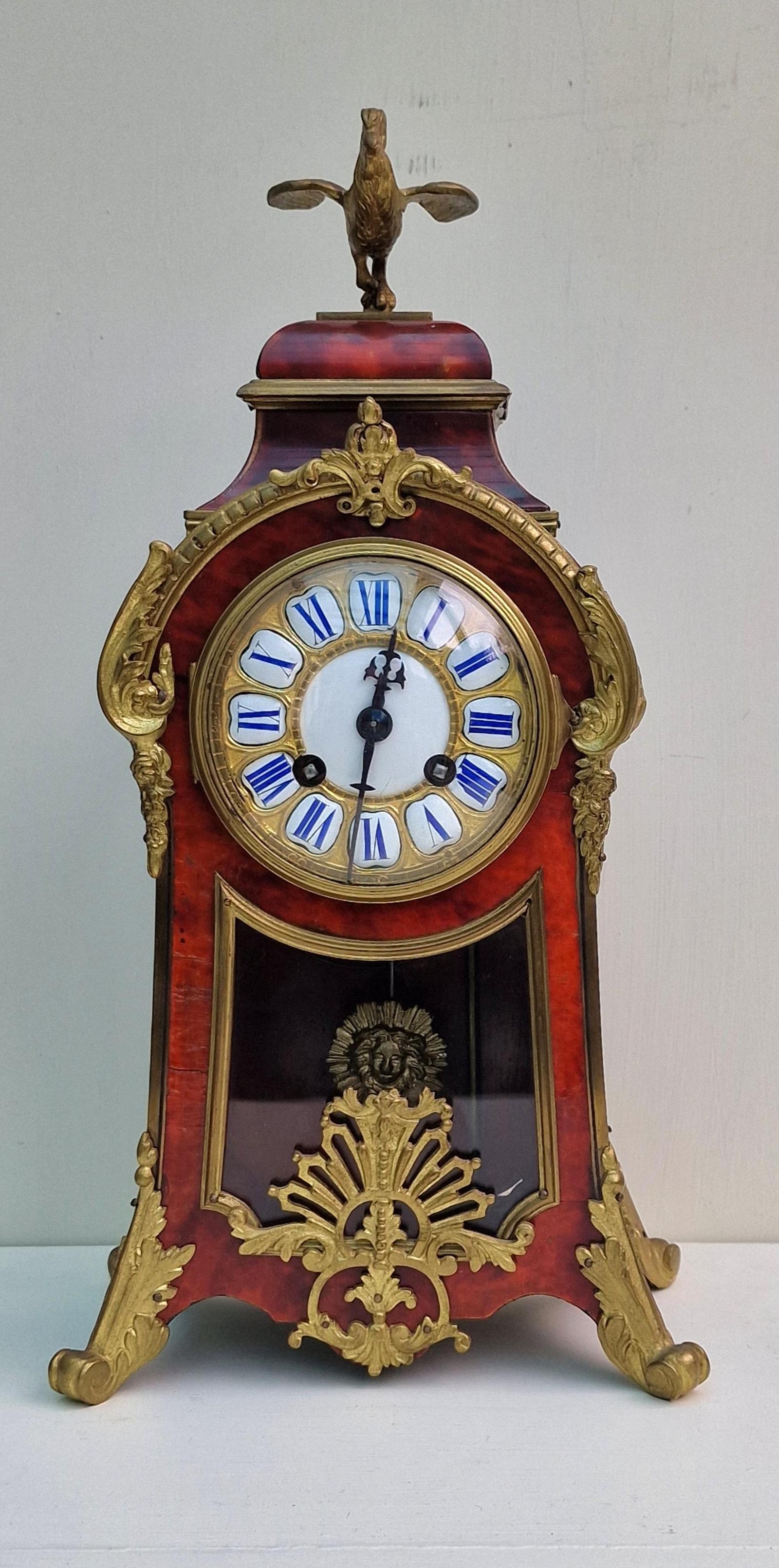 A good quality and impressive French tortoishell mantel clock. Red ground to the case with tapered sides. A glass front panel showing the pendulum. Rococo gilt bronze case mounts and surmounted by a bird. A raised gilt dial with individual enamel Roman blue numeral cartouches and blued steel hands.