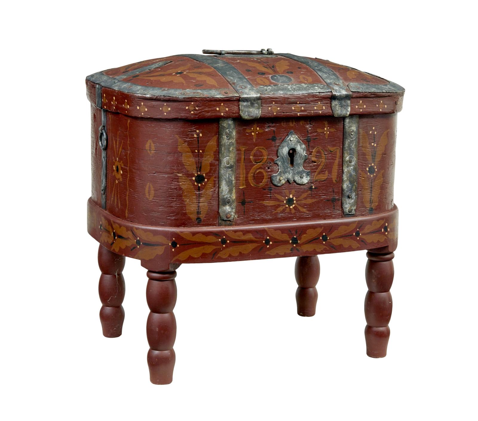 Traditional 19th Century Swedish shaped box on stand. Rustic made scandinavian metal bound strong box on later stand. Useful addition of a base makes this an ideal sofa side storage solution. Red/brown paint scheme with a muted orange floral design. Original metal strap work, hinges and lid handle. No lock. Expected minor surface marks to woodwork, in line with age and use. Later touched in paint at the time when the base was added.