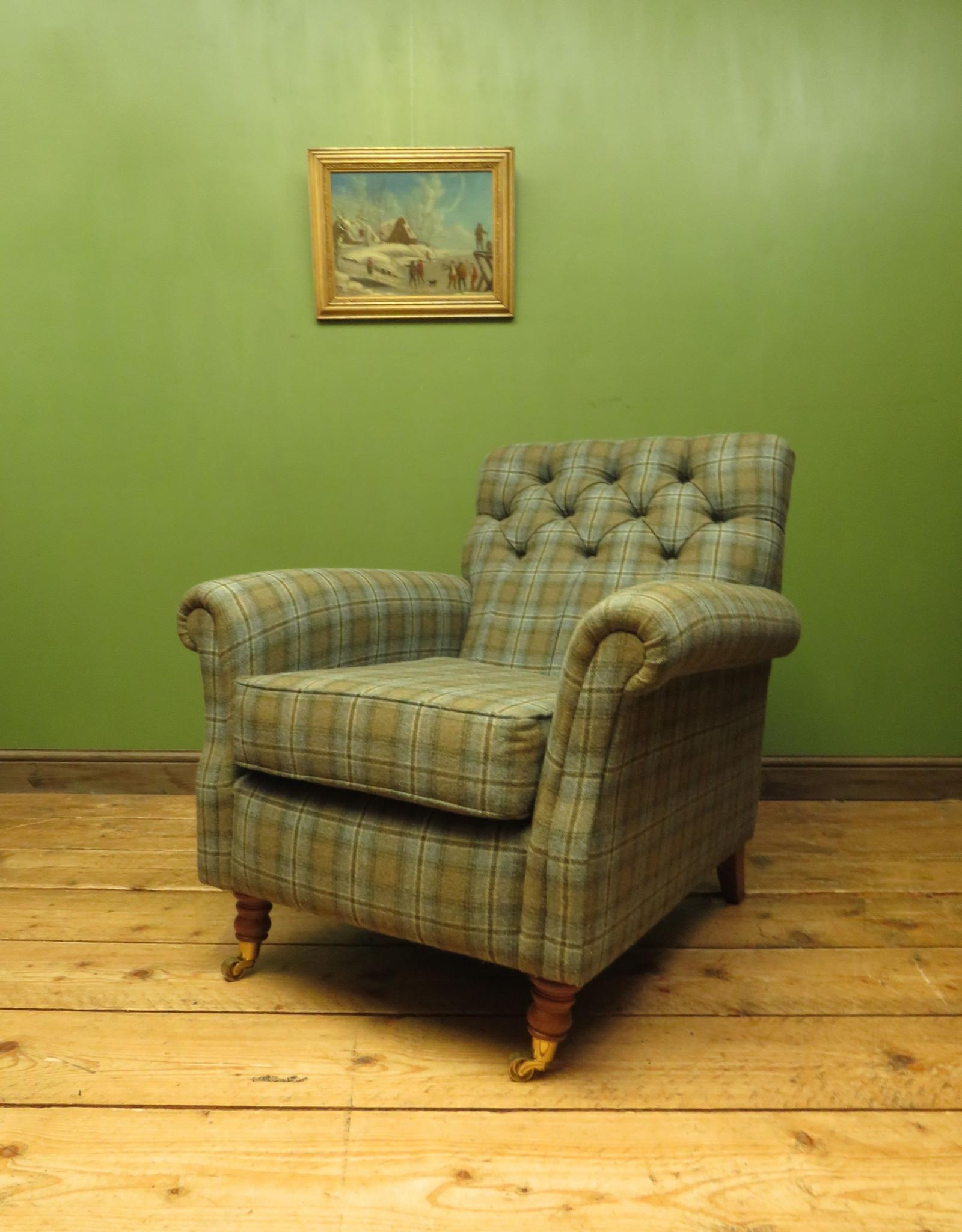 Traditional Style Blue Tartan Wool Armchair with Button Back
