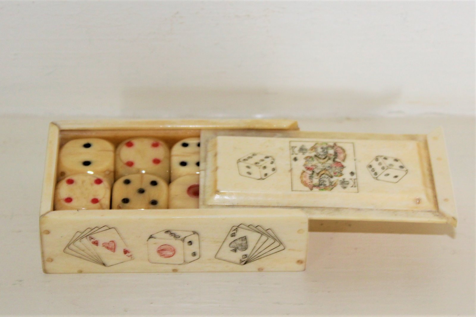 Travelling Gamblers Bone Box Containing Six Chunky Bone Dice, The Box is Engraved with Cards & Dice Possibly French c.1900 to 1930