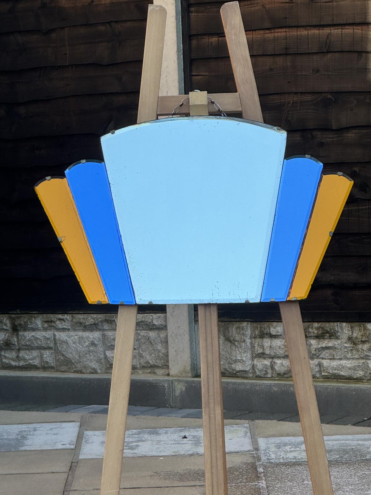 This mirror consists of five individual mirrored pieces. The centre Plate has a bevelled edge and is cut to provide the distinct fan shape which is synonymous with the Art Deco period. Either side of the centre section is a piece of peach mirror on the outside and a Blue mirrored section in the middle.