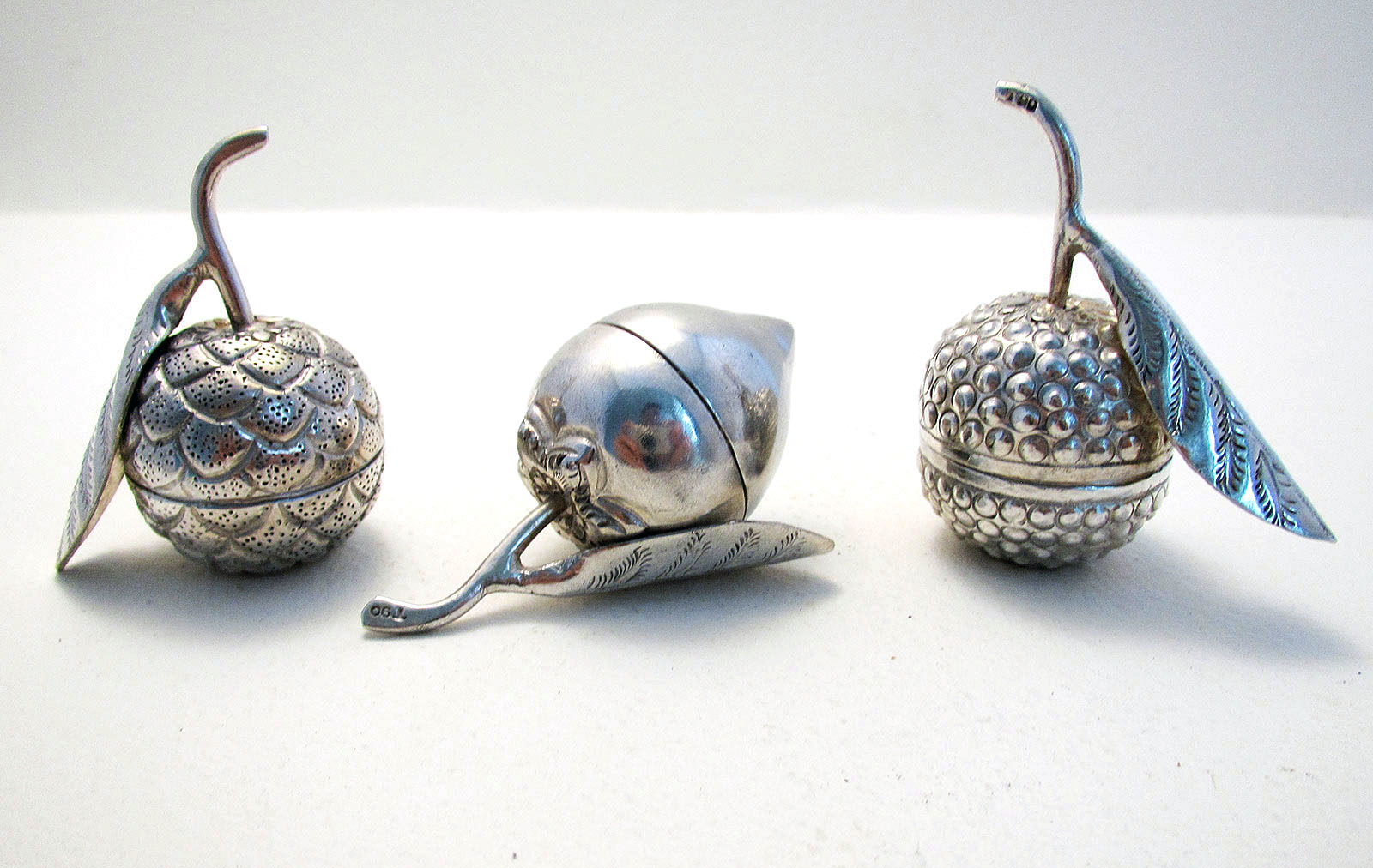 Trio Cambodian or Burmese Vintage Silver Plated Fruits Pill Snuff Novelty Box, Three Boxes, Stamped T90.
