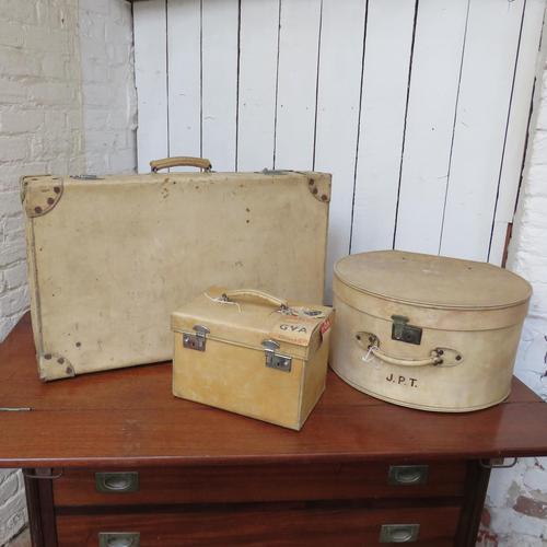 Set of three pieces of 1920s English vellum luggage. Suitcase from Aspreys of London, hat box and vanity case. Working locks but no keys.