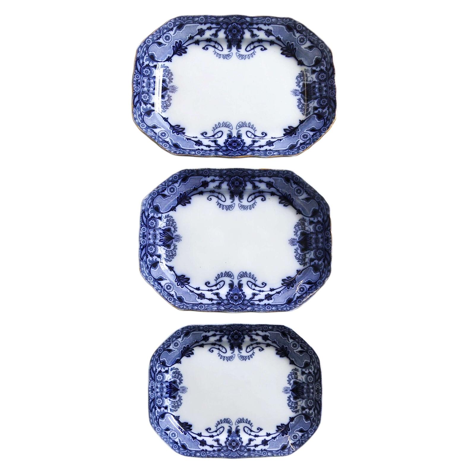 Trio of 19th‑century Staffordshire Raleigh pattern serving plates with bold blue‑and‑white decoration and scrolled edges… Decorative, graphic and highly collectible