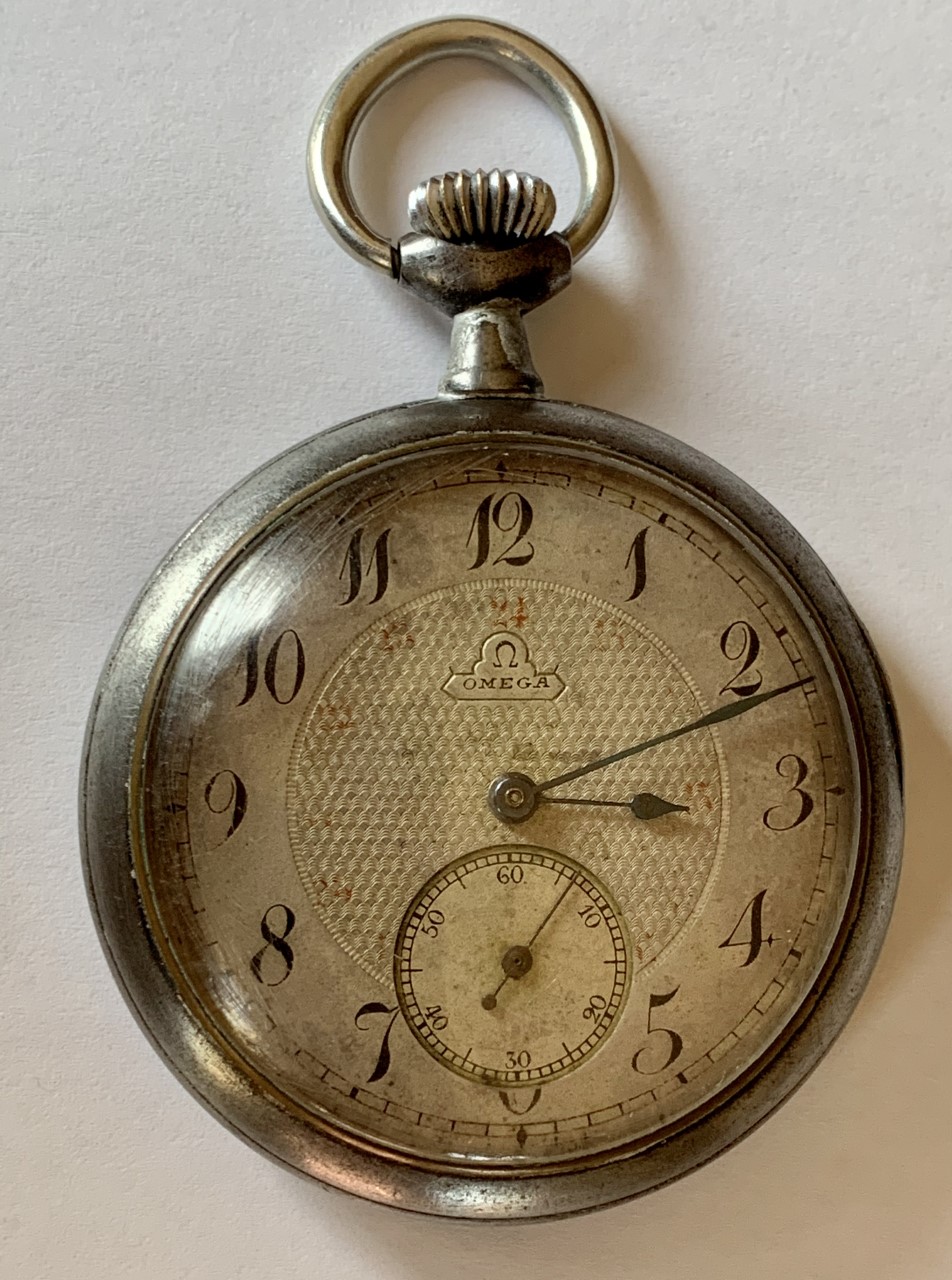 Triple Signed Omega Gun Metal Open Face Crown Wind Pocket Watch c.1930