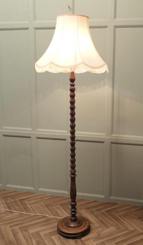 Turned Oak Floor Lamp, Standard Lamp The turned central column has a chunky bobbin turned wooden base, it is in good condition, the wiring is good, this is a very fine quality lamp and comes with an attractive lampshade The lamp is 72” high and the base is 12” in diameter and the shade is 23” in diameter TAH49