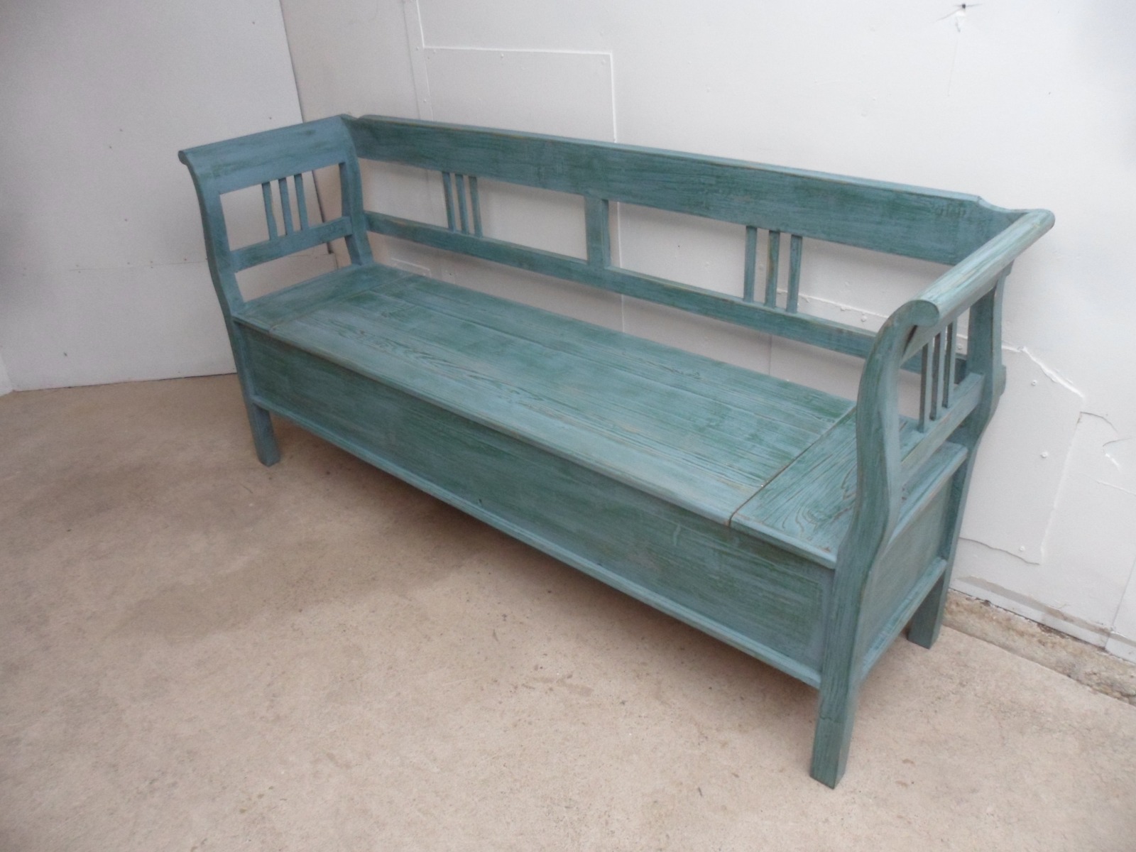 Turquoise & Green Small Painted Antique Pine Hall / Kitchen Box / Settle / Bench