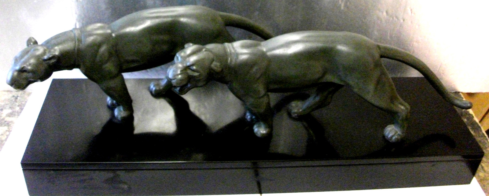 Two French Pewter Panthers by Ouline on Black Marble Base Signed