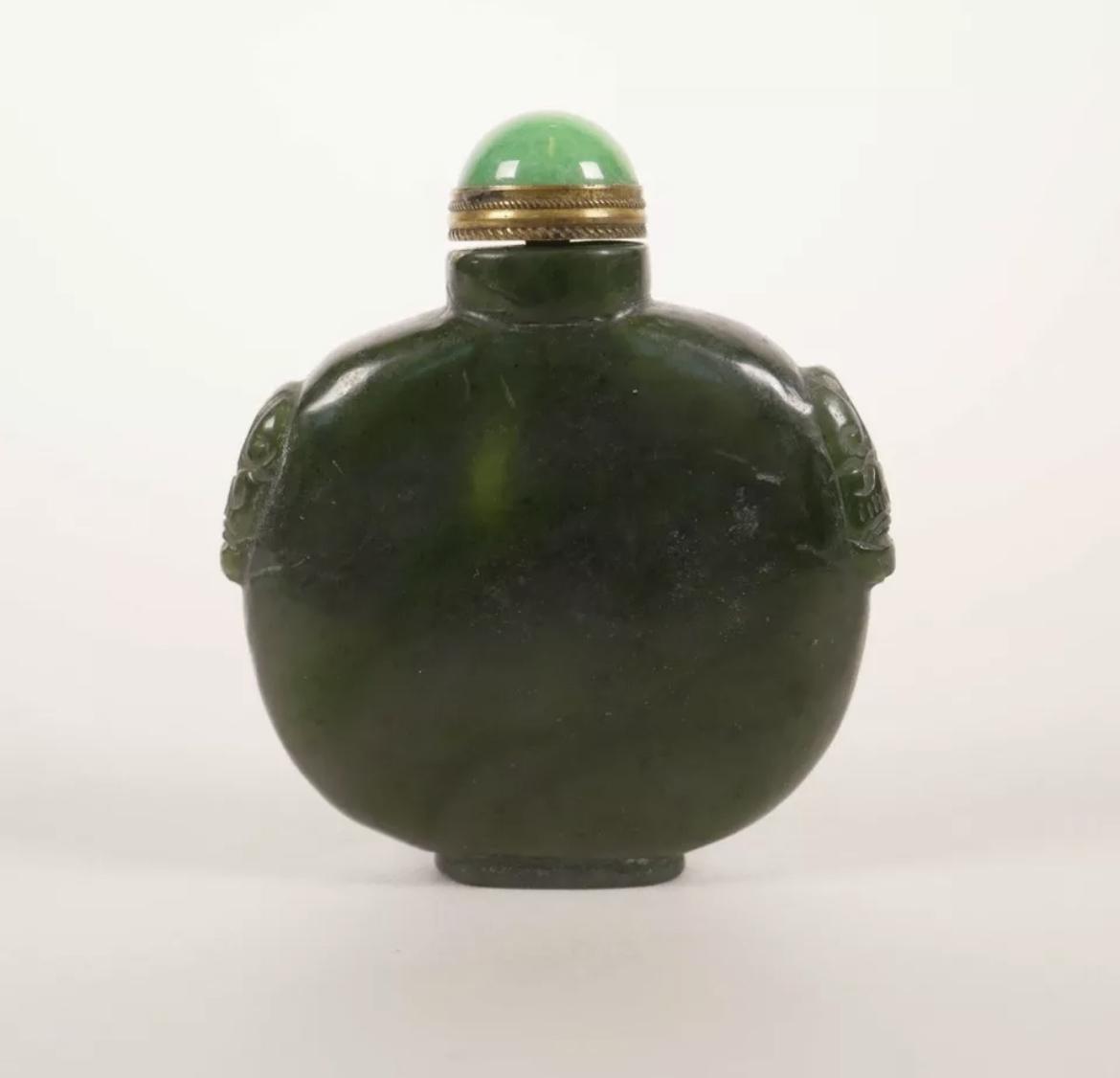 Two-Handled Chinese Spinach Green Jade Snuff Bottle - Unusual Carved Handles