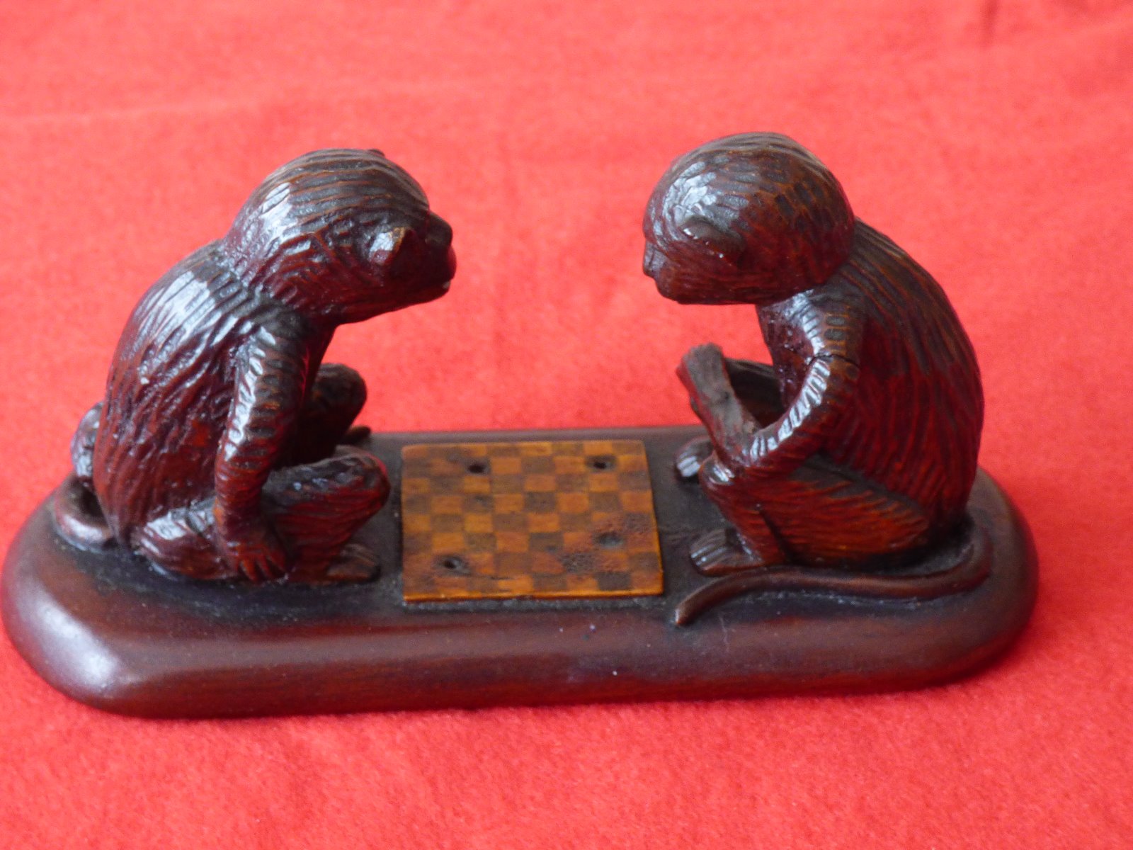 Two Monkeys Playing Chess Early 20th Century Wood Carving