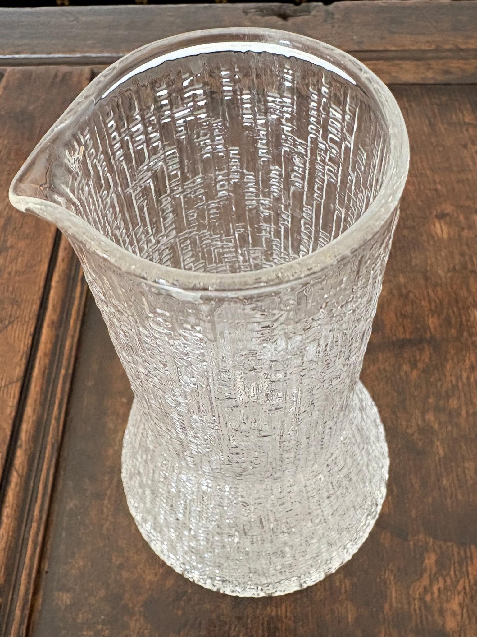 A beautifully tactile piece of Nordic modernism: this mid-century Finnish clear glass jug features an all-over textured surface that catches the light like ice and bark, paired with a sculptural flared base and a neat pinched pouring lip. It’s both functional and decorative, ideal as a water carafe, cocktail mixer, or simply as a statement piece on open shelving.